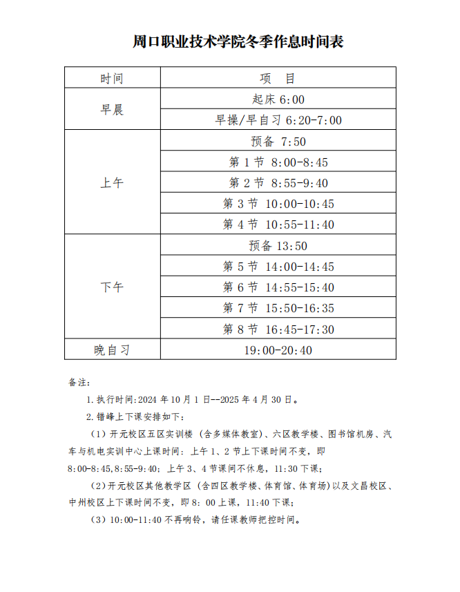 周口职业技术学院冬季作息时间表